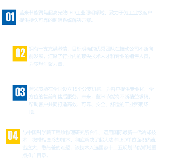 藍米節能聚焦超高光效LED工業照明領域,致力于為工業級客戶提供持續可靠的照明系統解決方案。 服務客戶遍布國內重工業、機械制造、軍工、鐵路、鋼鐵、電力、冶金、食品、電子等行業。公司所有產品通過國家強制性3C認,為廣大客戶提供優質、穩定、可靠的服務體驗。